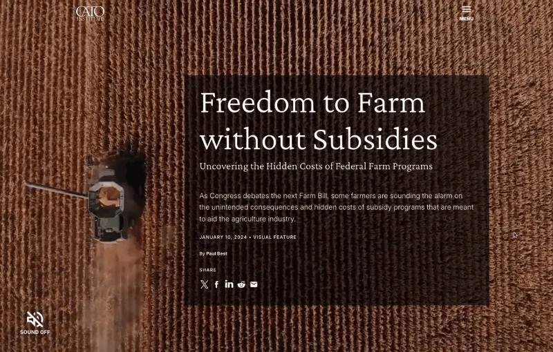 By utilizing multimedia and the "scrollytelling" format using Drupal and the GSAP library, we wanted to humanize complex policy conversations through using real farmers' voices. Farmers provided interviews and photographs to Cato's Policy Investigator, who also added policy context and historical background. I storyboarded the piece, integrating all these parts into a cohesive narrative. I also intentionally added sections with atmospheric videos and accompanying soundscapes, allowing the reader to "breathe" and setting the emotional tone.